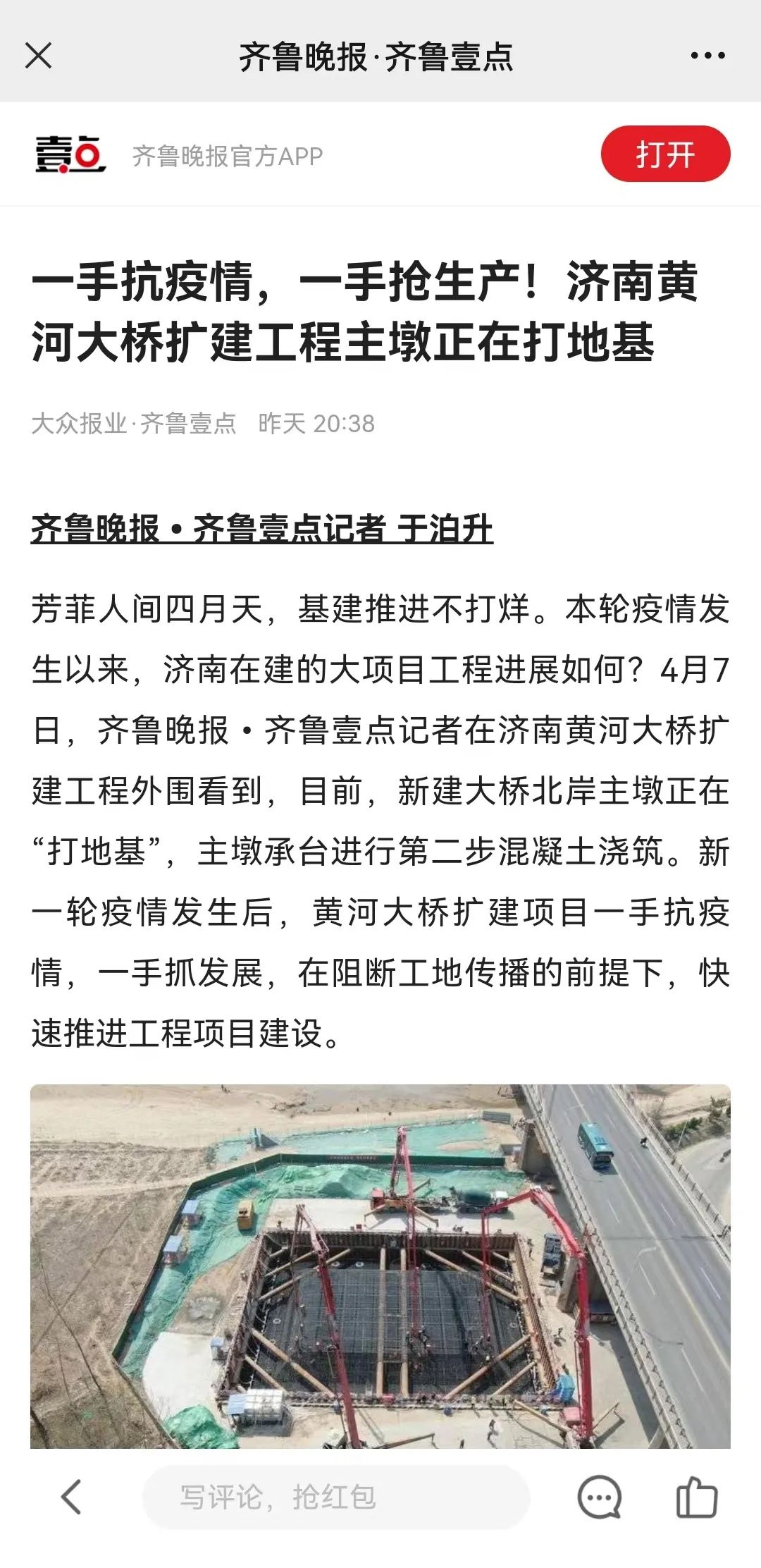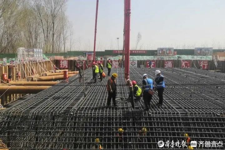 芳菲人間四月天,基建推進不打烊。本輪疫情發(fā)生以來,濟南在建的大項目工程進展如何?4月7日,齊魯晚報•齊魯壹點記者在濟南黃河大橋擴建工程外圍看到,目前,新建大橋北岸主墩正在“打地基”,主墩承臺進行第二步混凝土澆筑。新一輪疫情發(fā)生后,黃河大橋擴建項目一手抗疫情,一手抓發(fā)展,在阻斷工地傳播的前提下,快速推進工程項目建設(shè)。