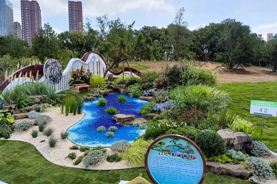自接到參賽任務后,城建集團公司高度重視,精心組織,選派業務技能扎實的專業技術人員參賽,將此次競賽作為展示集團形象的重要平臺。比賽過程中,參賽隊員積極克服天氣、選材、地形高差、異地施工等困難,在地形塑造、景觀施工、苗木栽植等環節中精益求精,以“泉城明月”作為參賽主題,融入節約環保、生態自然的理念,創新使用深藍、淺藍、白色三色琉璃石子漸變仿真水景,與花序、山景共同打造“一城山色半城湖”,再現“泉城月明”意境。